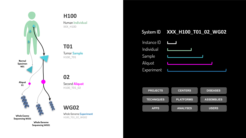 Isabl models a data generation process where Experiments such as Whole Genome Sequencing are performed on Samples collected from different Individuals. This normalization approach reduces data redundancy and improves data integrity.