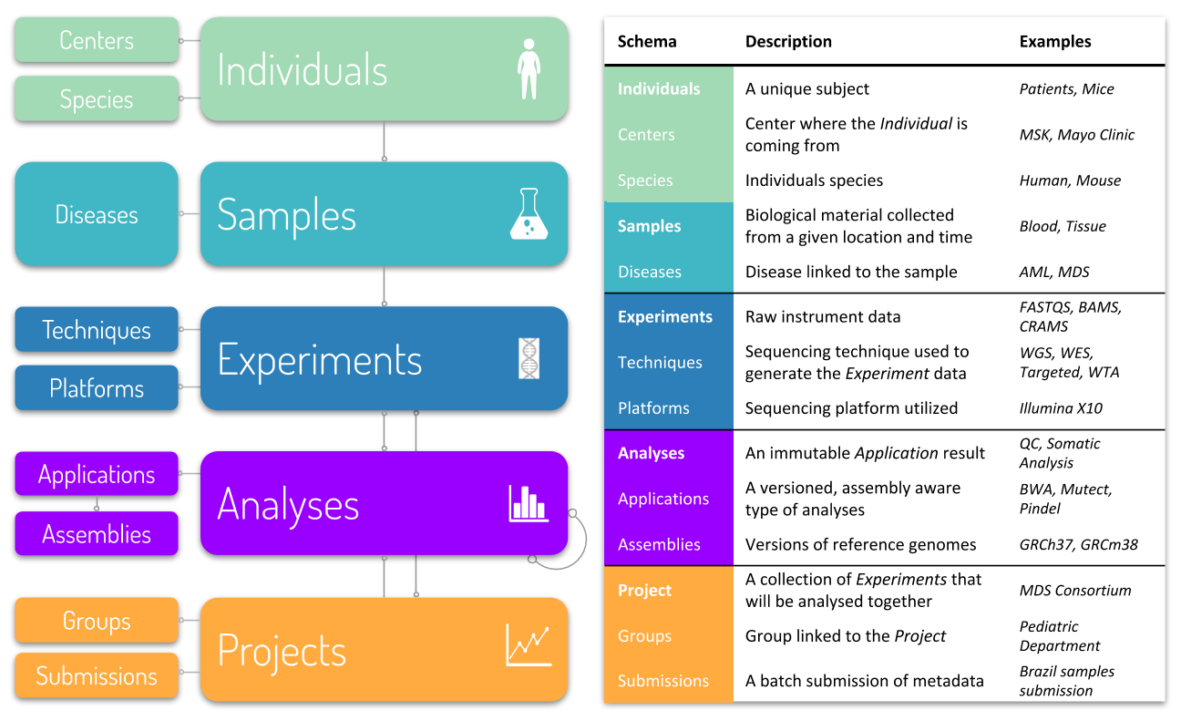 The concept of cohorts, where multiple Experiments are grouped and analyzed together, is fundamental and well supported. Furthermore, isabl also tracks and executes Assembly aware Bioinformatics Applications making sure that results are a function of the reference genome. Instances of these applications are also tracked and referred as Analyses.