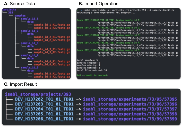 Isabl-CLI supports automated data import by recursively exploring data deposition directories and matching raw data files with identifiers registered in the database. For example, the client can be instructed to explore the /projects